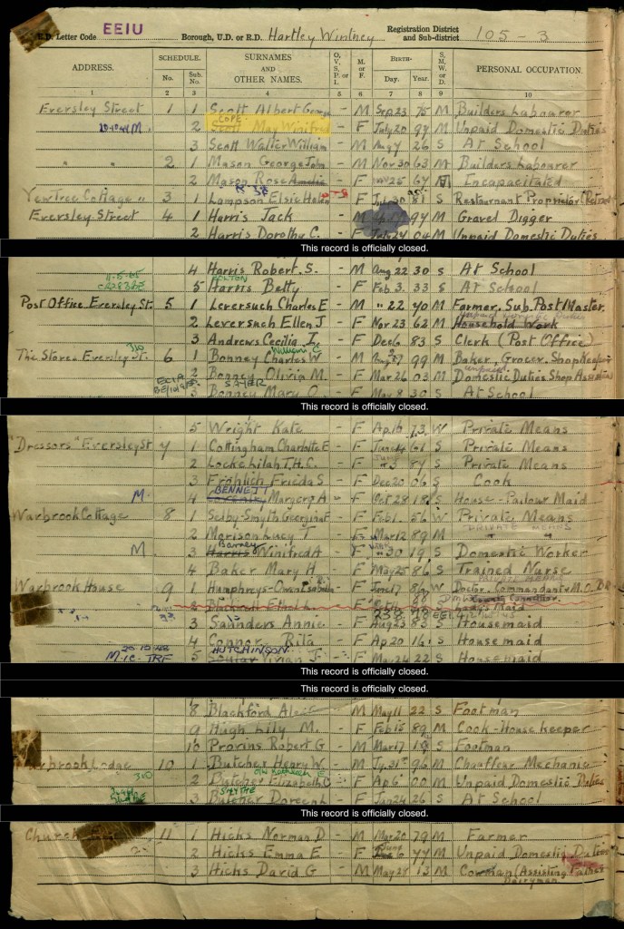 May was living with her husband Albert and their youngest son Walter on Eversley Street in Hartley Wintney, Hampshire. May’s date of birth was recorded as 20 July 1897; Albert’s as 23 September 1875; and Walter’s as 7 August 1926. Albert was working as a builder’s labourer and son Walter was at school. The 1939 Register shows that May remarried and became May Cope. May’s husband Albert died in 1943 in Reading. May remarried the following year; her new husband was Francis Alfred Cope. I’m not 100% certain but I think Francis was born in 1883 in Lincoln. I’m not sure if they had any children. I have not found May and Albert’s eldest son David on the Register.
