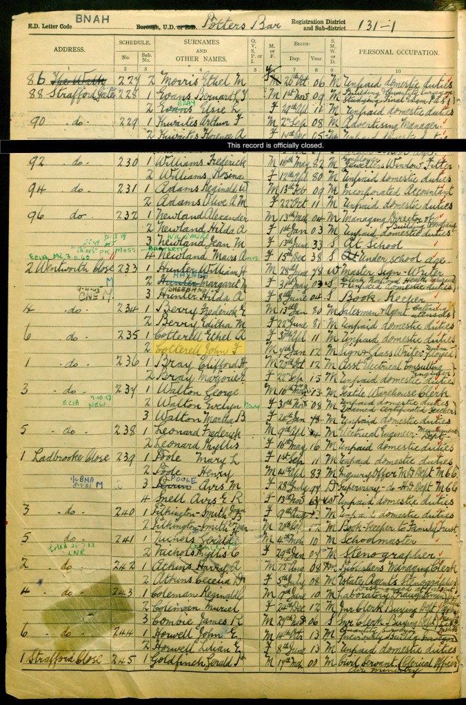James and Jennie’s youngest son John was living at 6 Wentworth Close in Potters Bar with his new wife Ethel. John’s date of birth was 7 January 1912, and Ethel’s was 30 April 1911. John’s occupation is recorded as a sign glass writer, unemployed. There are no children recorded.