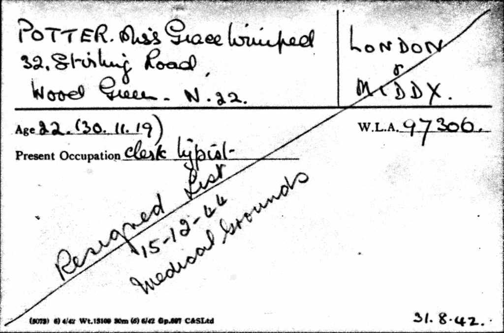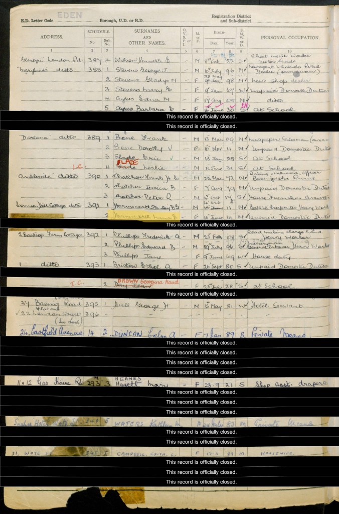 Edith was living with her husband Bertie and their daughter Grace at 32 Stenberg Road in Wood Green, London. Edith’s date of birth was recorded as 23 August 1890; Bertie’s as 13 September 1893; and Grace’s as 10 November 1919. Bertie’s occupation was police constable and Grace was working as a filing clerk for Lloyd’s Insurance. The Register also shows that Grace later married becoming Grace Roberts.