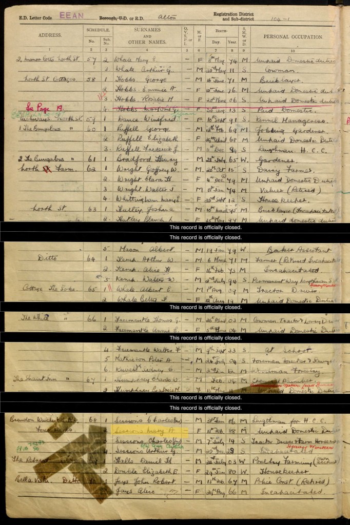 Mary was living with her husband Charles, their eldest son Charles, and their youngest son Arthur, at an address in Alton, Hampshire. Charles senior’s date of birth was recorded as 31 January 1886, and his occupation was ‘lengthman for H.C.C.’. I believe this means that he was responsible for keeping a section of train track or road safe. Their eldest son Charles (junior) was a tractor driver and farm horseman, and his date of birth was 7 July 1914. Their youngest, Arthur, was born 22 December 1923. I am unsure what is written under his employment, other than stating ‘heavy worker’. Mary’s date of birth was 13 February 1888. I have not been able to locate their third son Ronald.
