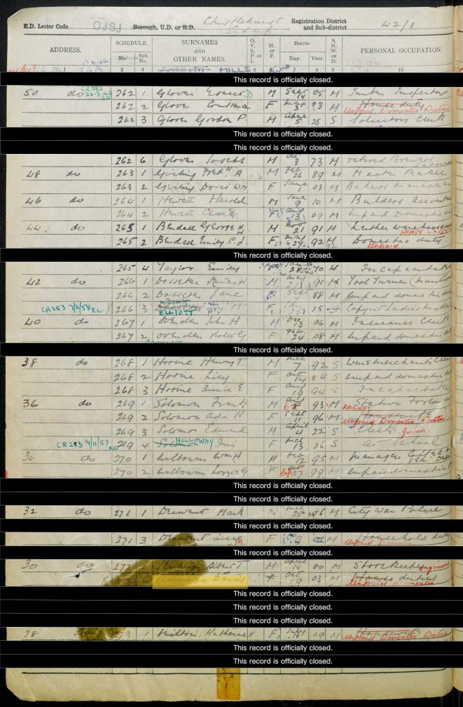 Lizzie’s daughter Daisy was living with her husband Albert at 30 Elmstead Avenue in Chislehurst. There are three closed records which are likely those of their three sons. Daisy’s date of birth was 19 October 1903, and Albert’s was 14 April 1900. He was a storekeeper.