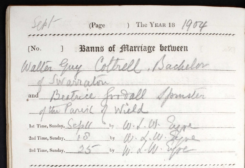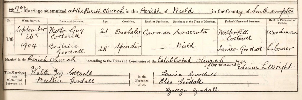Walter Guy married Beatrice Goodall on 26 September 1904 at St. James’ Church in Wield, Hampshire. Beatrice was born in 1876 in Alton. Her surname as registered at birth was Godall. They had had no children between the date of their marriage to when the next Census was recorded. Below is a copy of their wedding banns and their marriage certificate. At the time of their marriage, Walter Guy’s occupation was ‘cowman’.