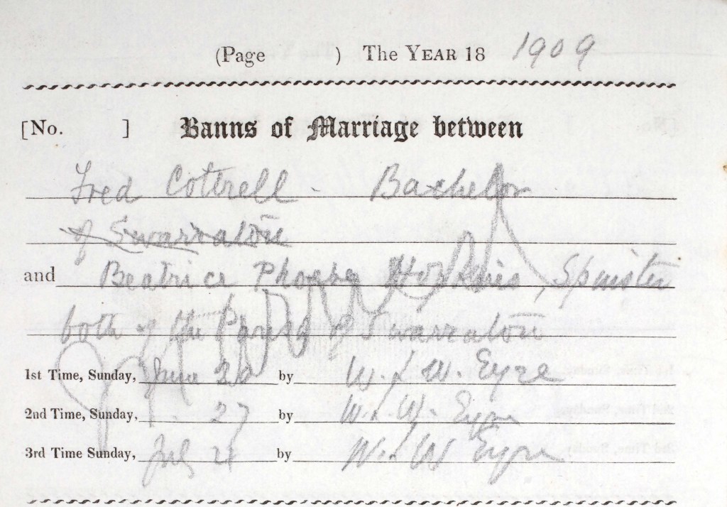 Fred married Beatrice Phoebe Hopkins on 10 July 1909 at the local Northington church. Beatrice was born in 1886 in Kingsclere, Hampshire. Between the year of their marriage to the next Census, they had one son called William Fred, born 1910. Below is a copy of their wedding banns and their son William’s baptism on 11 September.