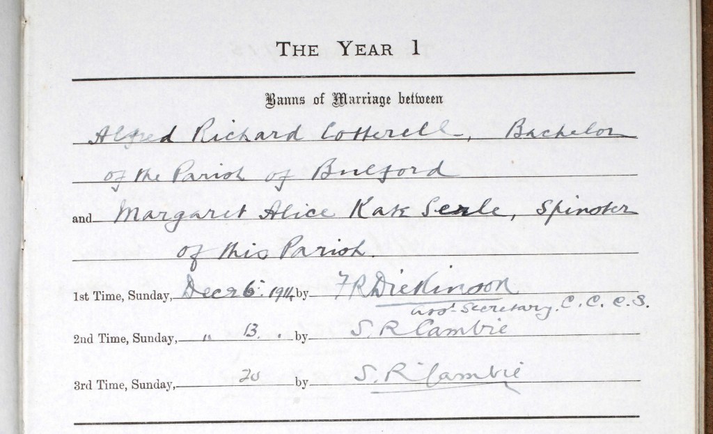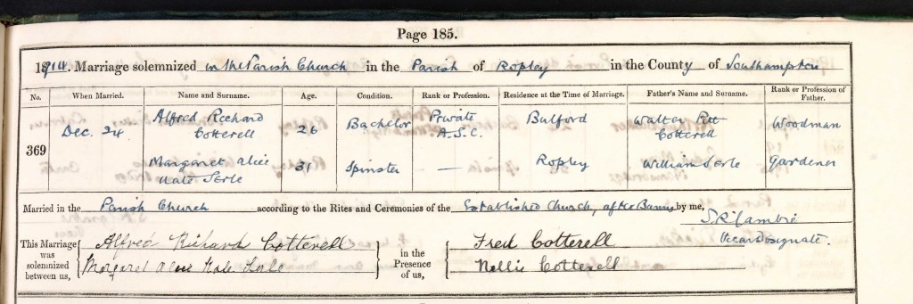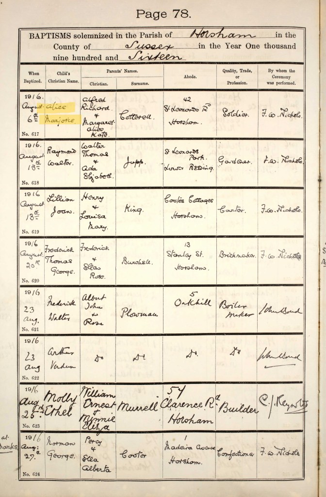 Alfred married Margaret Alice Kate Serle on 24 December 1914 in Ropley, Hampshire. Margaret was born in 1883 in Westhampnett, Sussex. A copy of the marriage banns and wedding certificate is below. One of the witnesses is given as Nellie Cotterell but I am not sure who this is yet. They had two daughters before the next Census: Alice Marjorie, born 12 July 1916, in Horsham, Sussex; and Ivy Joyce, born 1921, in Easthampstead, Berkshire. Alice was baptised at St. Mary’s Church in Horsham on 6 August. I haven’t found a record of a baptism for Ivy.