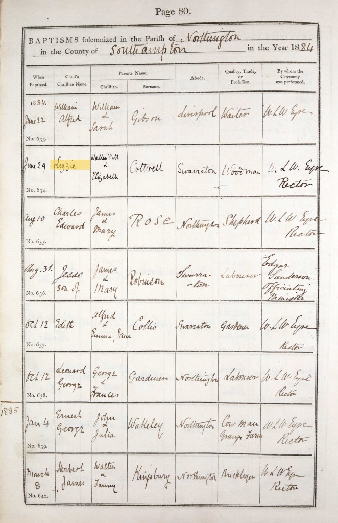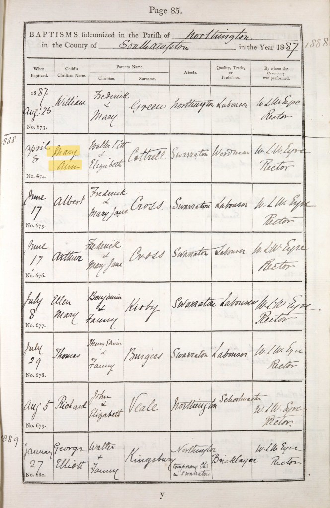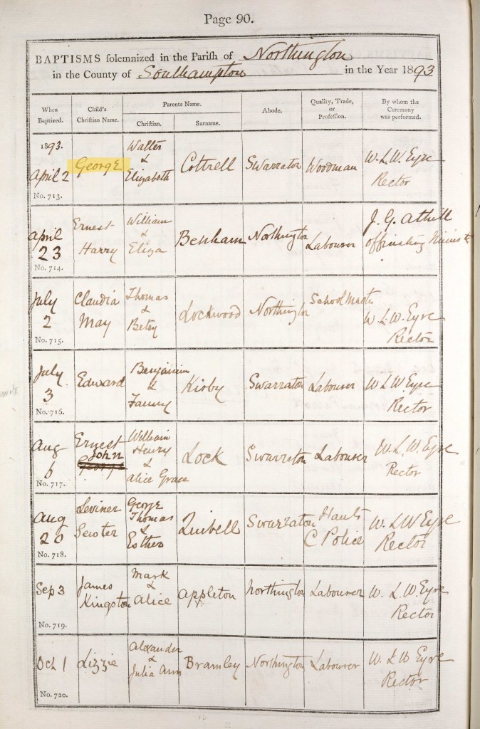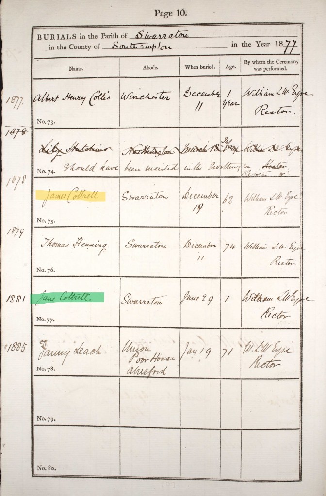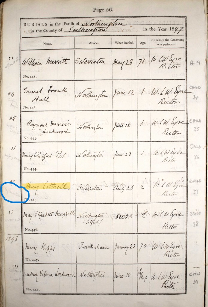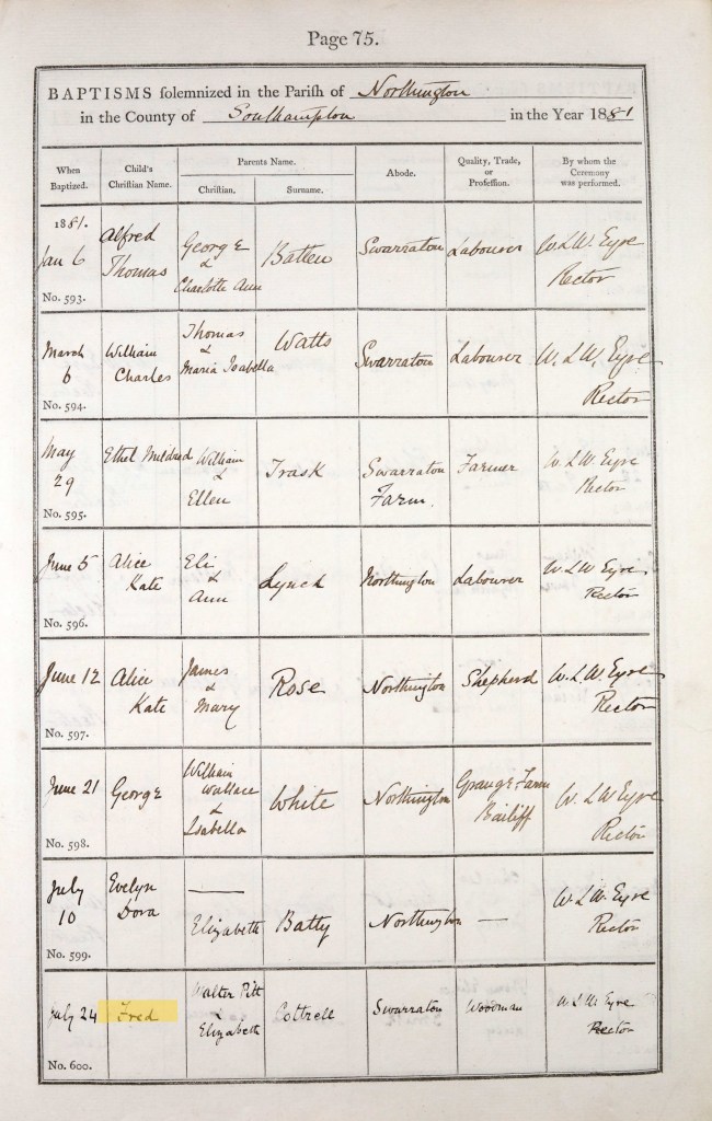 Richard Cotterell passed away in 1888, aged 1. I assume his younger brother Alfred born the following year was given his name as a middle name in Richard’s memory. Richard was buried at the local church by Rector Eyre on 24 April. He is buried in Northington Old Churchyard which surrounds the site of the old church (the current church having been built in 1890).