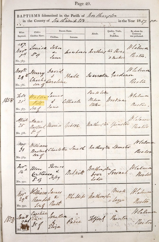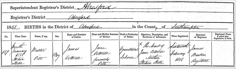 Walter Pitt Cotterell was my 2nd great-grandfather. He was born on 9 January 1858 in Itchen Stoke, Hampshire. His birth certificate gives his father’s name as James Cottrell (occupation agricultural labourer) and his mother’s name as Jane Cottrell, formerly Pitt. It’s interesting to note that Walter’s surname was spelt differently at the time of his birth, and that his middle name was Pitt, which was his mother’s maiden name. This was common practice at the time.