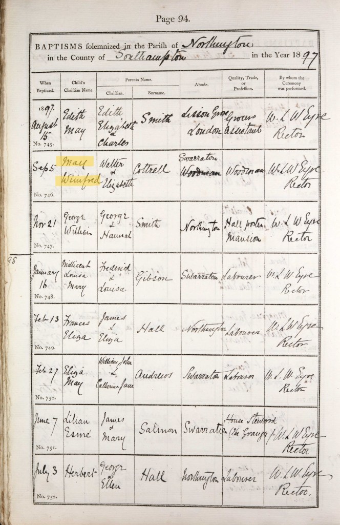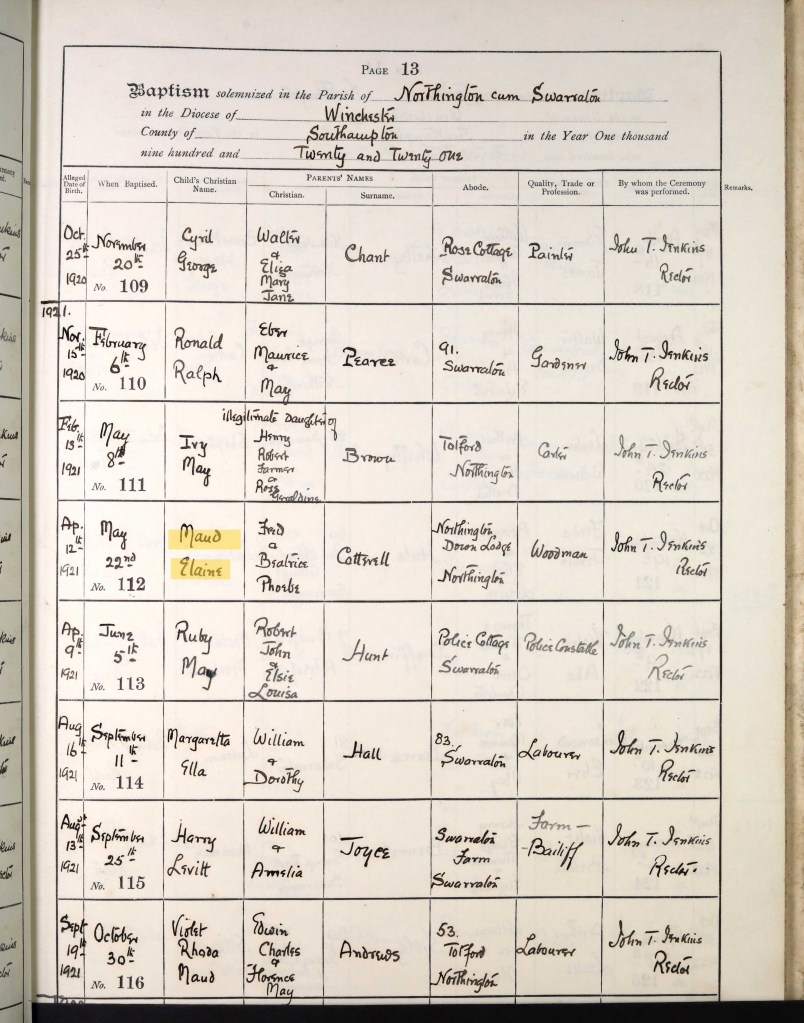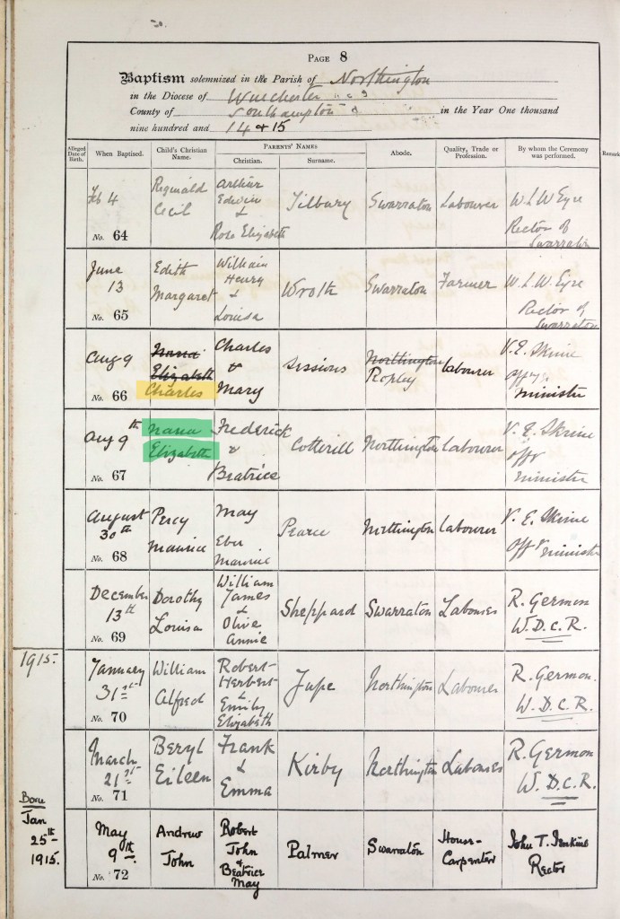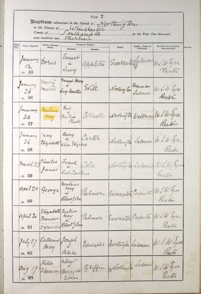 Between the 1911 and 1921 Census, Fred and Beatrice had four more children: Beatrice Mary, born 1912 and baptised on 26 January 1913; Elizabeth Nana, born 1914 and baptised on 9 August on the same day as her cousin – see above; Norman, born 11 September 1915 and baptised on 21 September – see above; and Maud Elaine, born 12 April 1921 and baptised 22 May. Sadly, baby Norman died at just 12 days old and was buried at St. John the Evangelist Church on 26 September by Rector John Jenkins. There is no record of a plot or memorial stone for him. All of the children were born in Alresford and baptised at the Northington church.