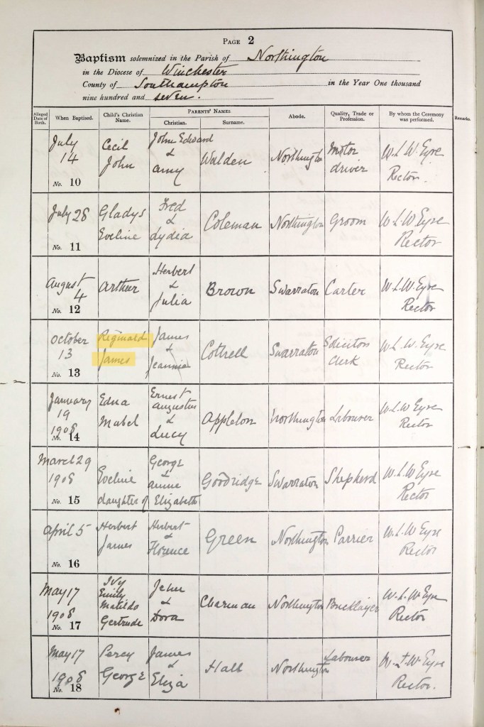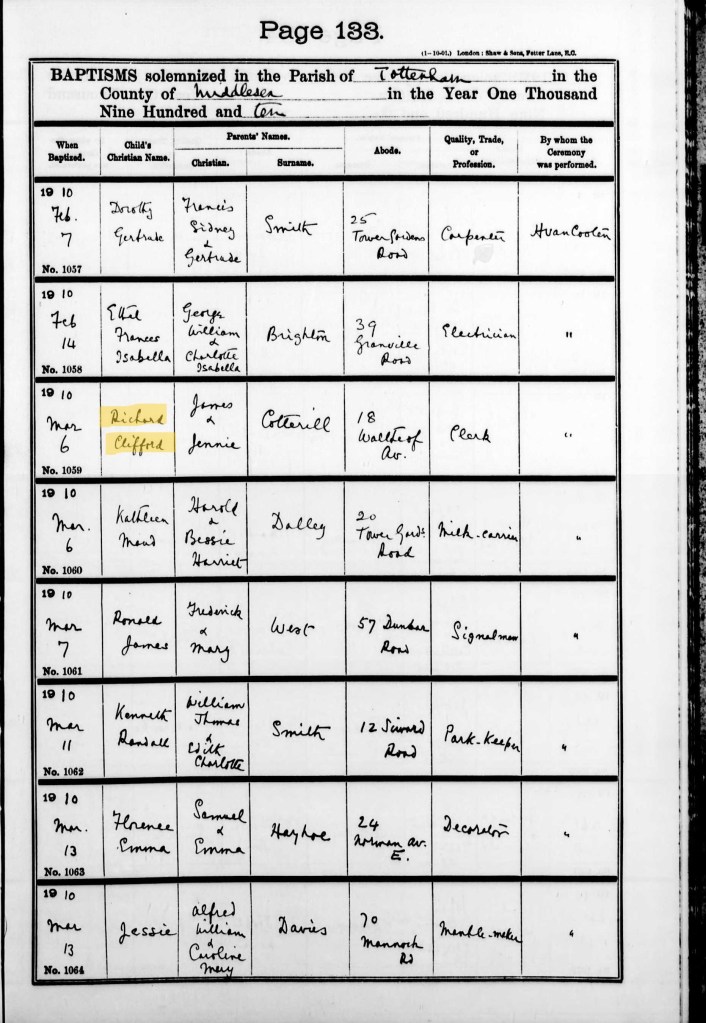 James and Jennie had three children in the period between their marriage and the next Census: Emily Alice, born 1906 in Fulham; Reginald James, born 1907 in Wandsworth; and Richard Clifford, born 1909 in Edmonton. Below is a record of Reginald’s baptism on 13 October 1907 at the Northington church (Jennie’s name has been recorded as Jeannie in error) and Richard’s baptism in Tottenham on 6 February 1910 (no records located for Emily at present).