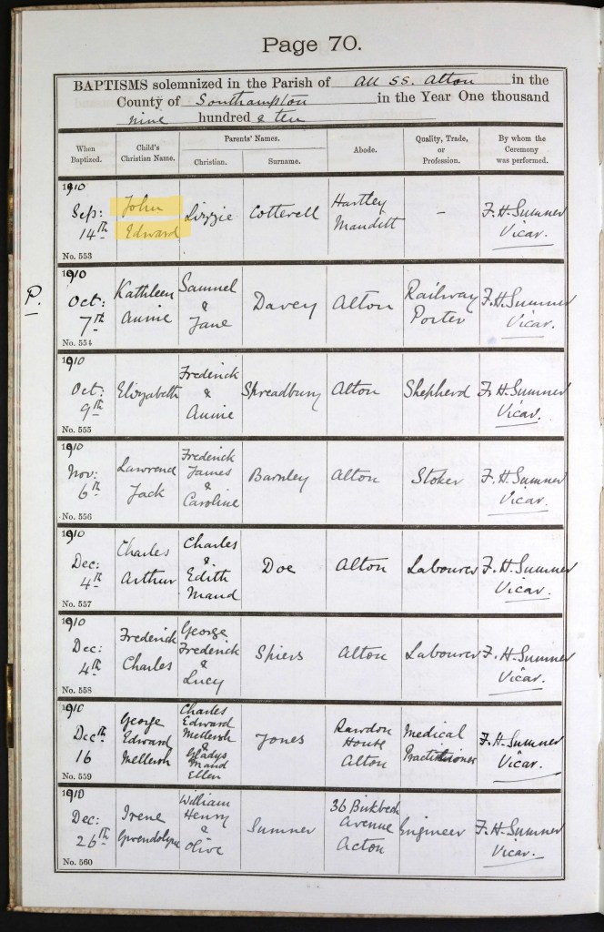 John was baptised on 14 September 1910 at All Saints Church in Alton.