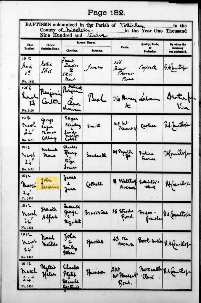 James and Jennie had a fourth child in 1912, a son called John Frederick, born in Edmonton. He was baptised at All Hallows Church in Tottenham on 24 March. Jennie’s name has been recorded as Jane in error.