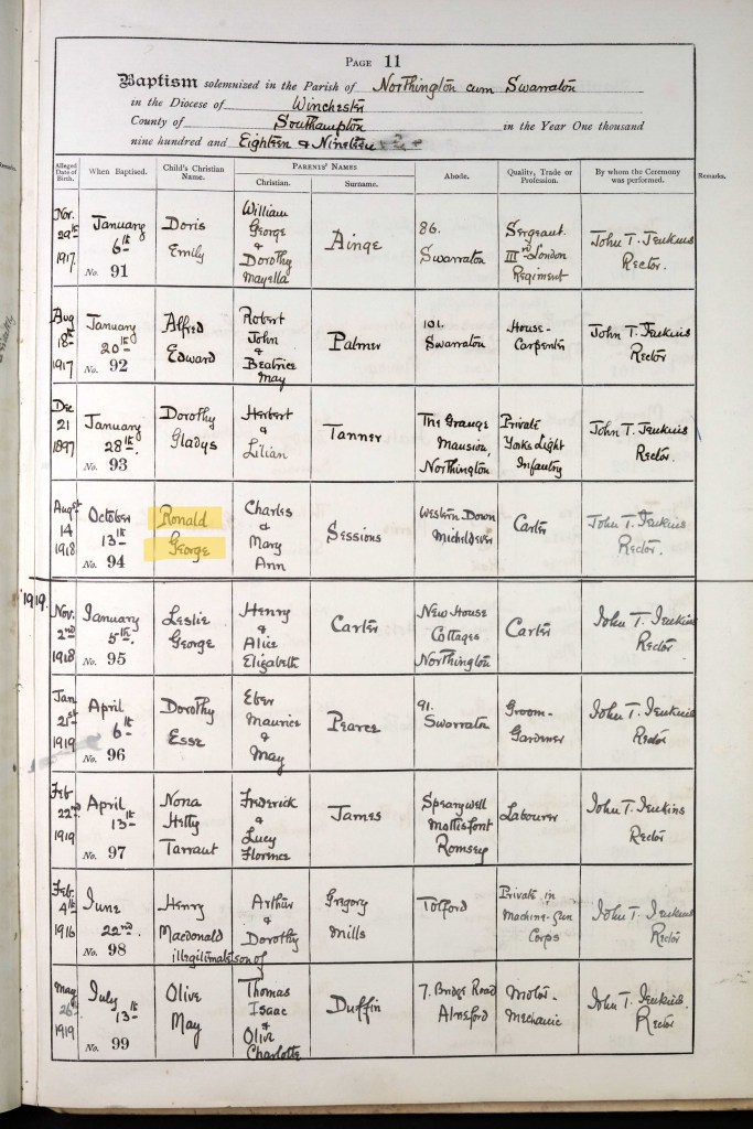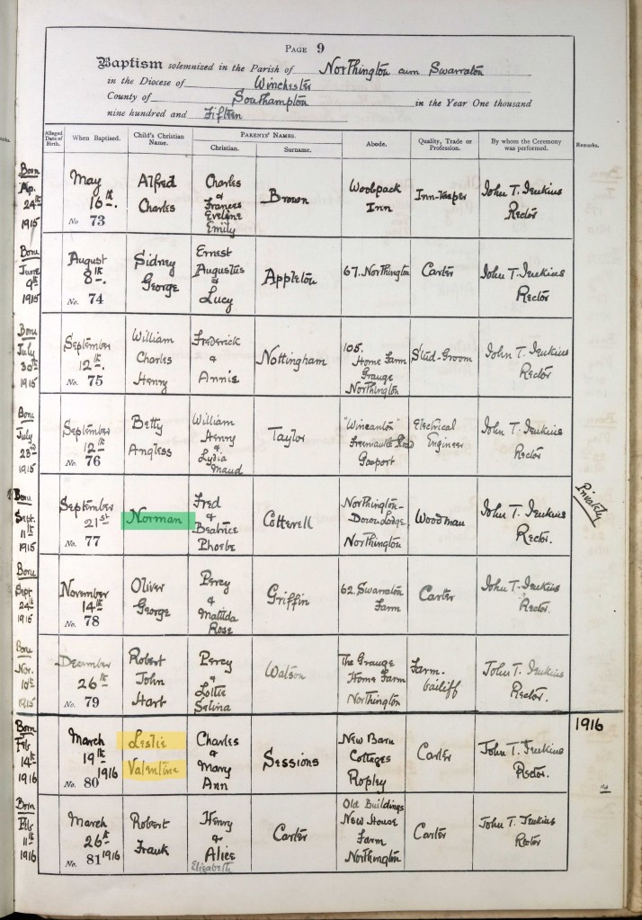 Mary married Charles Sessions in 1912 at the local Northington church. Charles was born in 1886 in Winchester, Hampshire. They went on to have three sons before the next Census: Charles, born 1914, in Alresford; Leslie Valentine, born 1916, in Alresford; and Ronald George, born 1918, in Winchester. Charles (junior) was baptised on 9 August 1914 on the same day as his cousin Elizabeth Nana, Fred and Beatrice’s daughter (recorded as Nana Elizabeth in the baptism register). Leslie was baptised on 19 March; the record also gives his full date of birth which explains his middle name as he was born on Valentine’s Day. Another cousin (Norman, the son of Fred and Beatrice) is also listed on the same page. Ronald was baptised on 13 October, having been born on 14 August. All baptisms took place at the Northington church.