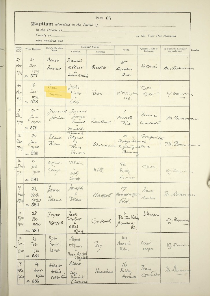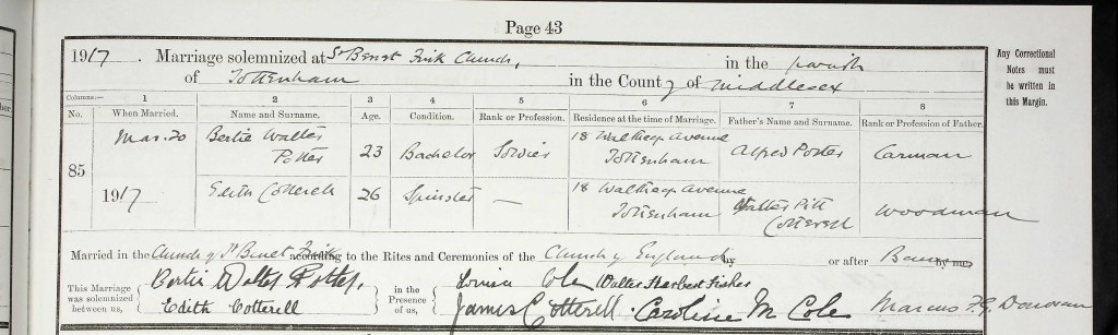 Edith, aged 26, married Bertie Walter Potter, aged 23, on 20 March 1917 at St. Benet Fink Church in Tottenham, London. Bertie’s occupation was recorded as soldier and the address given was in Tottenham. Bertie’s father, Alfred, was a carman. There were five witnesses, including Edith’s brother James. Bertie was born in 1893 in Stow, Suffolk. Before the next Census, they had one daughter called Grace Winifred born in 1919 in Hackney, London. She was baptised at the church where her parents married on 18 January 1920. The baptism record also shows the date she was born; 30 November 1919.
