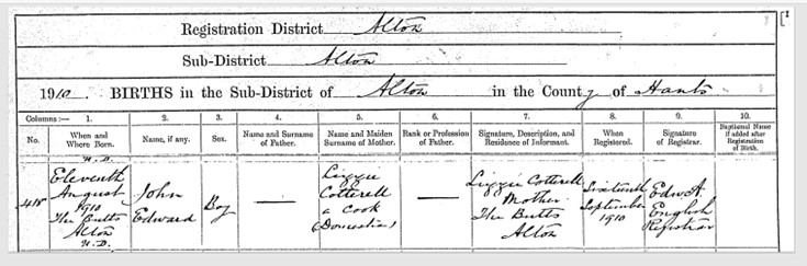 John’s birth was registered in the third quarter of 1910, middle name Edward. On the GRO database, there is no maiden name recorded, which could possibly mean that Lizzie was not married when she gave birth to him. I ordered a copy of John’s birth certificate to find out more. This showed that John was born on 11 August 1910 in Alton. Lizzie was recorded as his mother and her occupation was recorded as a domestic cook. There is no father recorded on his birth certificate, which confirms that she was most likely not married at the time of the 1911 Census. The mystery remains as to who John’s father was.