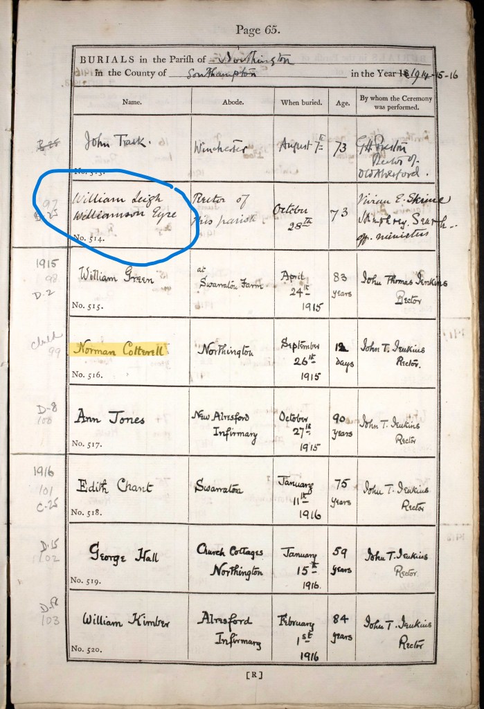 Interestingly, on the same page as the record of Norman’s burial, is the record of the burial of Rector Eyre on 28 October 1914. Rector Eyre baptised, married and buried many of my family members.