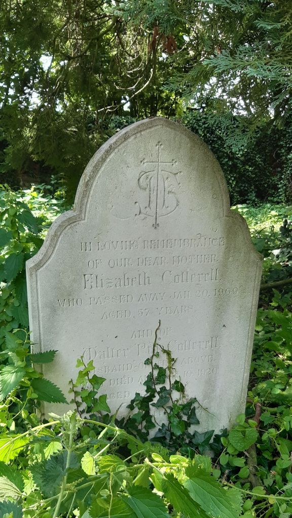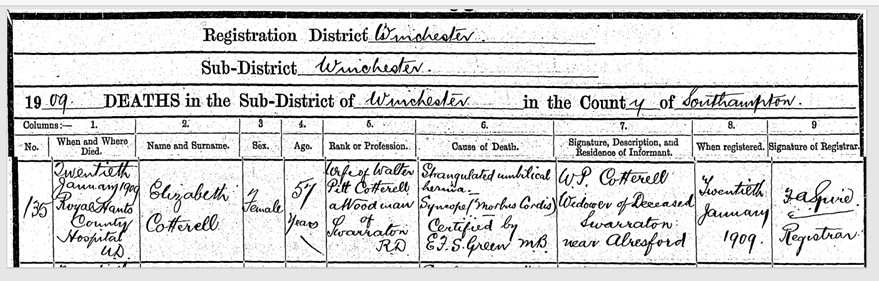On 20 January 1909, my 2nd great-grandmother Elizabeth died, aged 57, of a strangulated umbilical hernia at the Royal Hampshire County Hospital. She was buried at St. John the Evangelist Church on 25 January by Rector Eyre, the same priest who had married her and Walter in 1878. The church records show that there is a memorial stone for her, and I hope to visit the church in the future to lay flowers. On the same page of the burial book, there is also a Louisa Cottrell but I am not sure who this is at present.