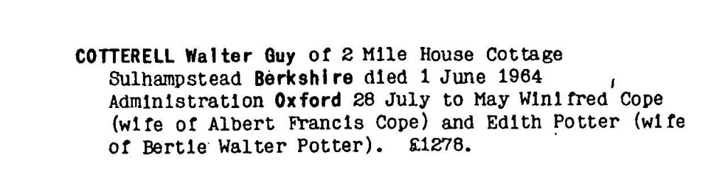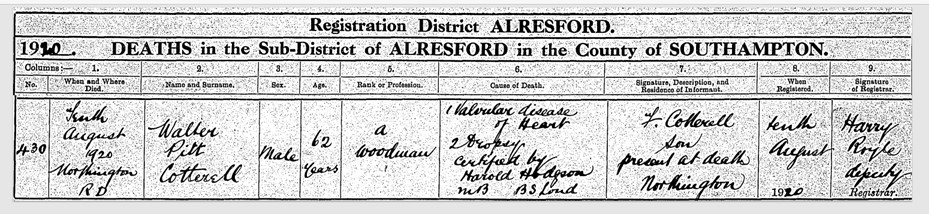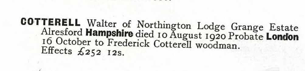 The National Probate Calendar states “Walter Cotterell of Northington Lodge Grange Estate Alresford Hampshire died 10 August 1920. Probate London 16 October to Frederick Cotterell, woodman. Effects £252 12s.”