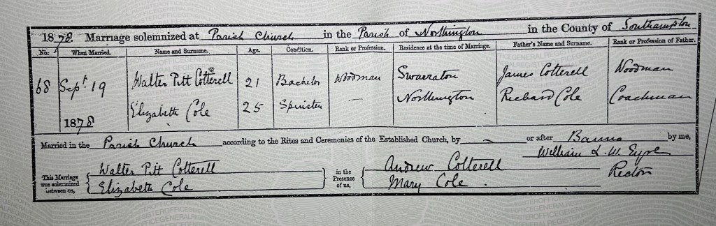 Walter’s occupation was recorded as woodman, the same as his father James. Elizabeth’s father Richard’s occupation was recorded as coachman. The witnesses were Andrew Cotterell and Mary Cole. I am not sure yet who Andrew was, however, he is recorded as living next door to Walter and his family at the time of the 1871 Census (possibly Walter’s uncle?). Mary Cole was Elizabeth’s sister.